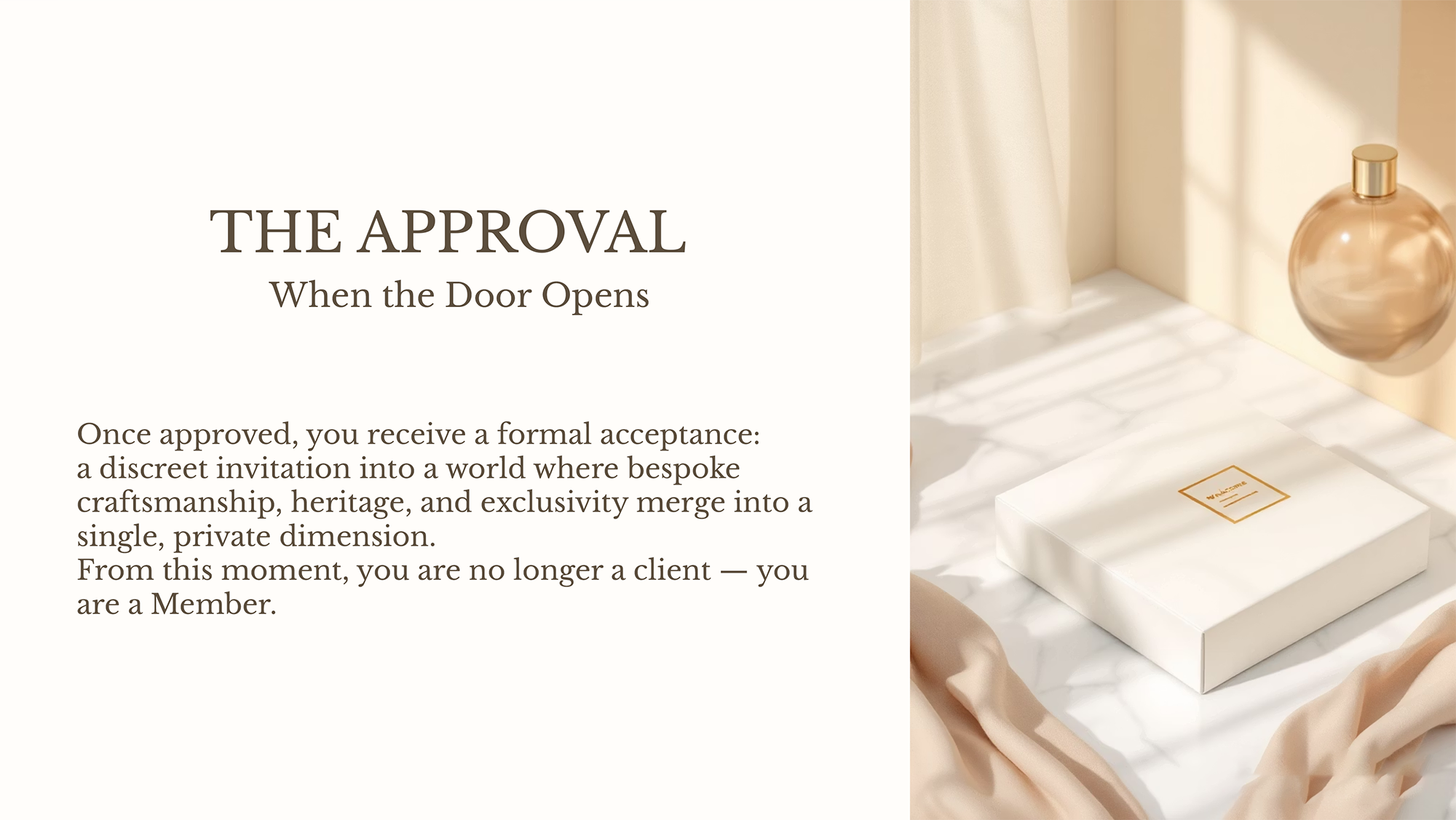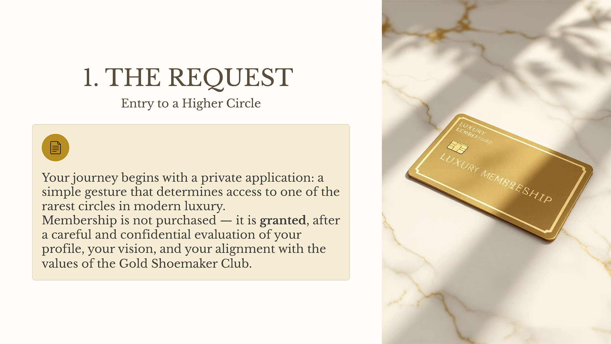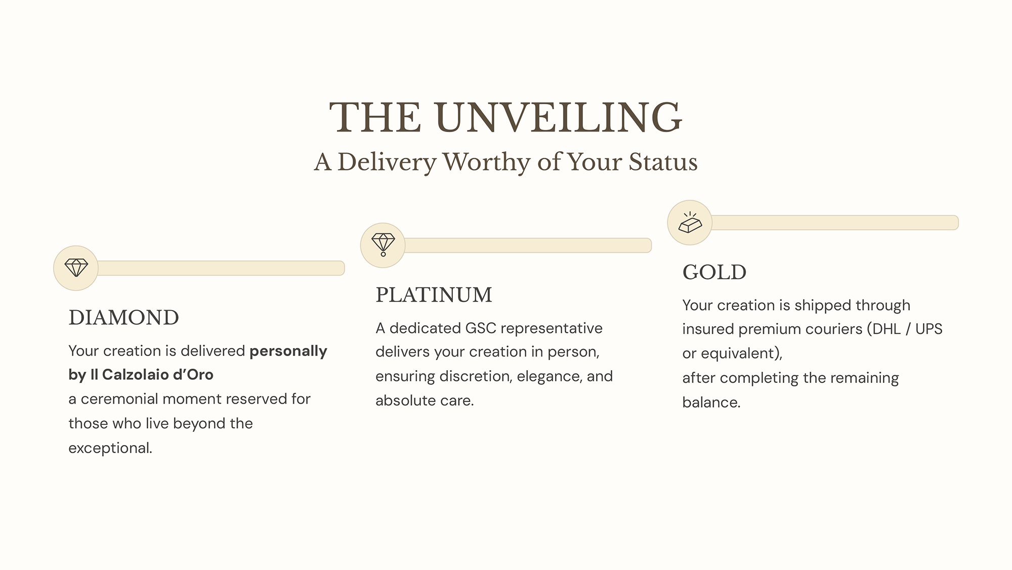 In the Gold Shoemaker Club, nothing is ordinary. Every phase, from your private request to the moment your creation is delivered into your hands , follows a discreet and meticulously orchestrated path reserved for those who live beyond the expected. Here, the process itself becomes part of the luxury: an intimate journey shaped around You, your vision, and the art of true bespoke excellence.